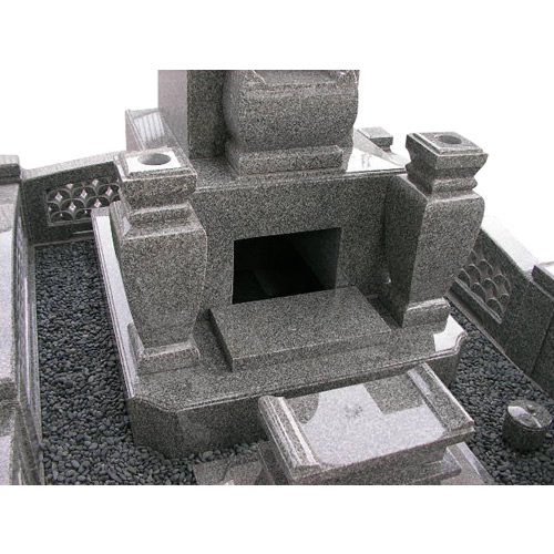 ■墓石…9寸角キセ型/1枚石仕様 ■巻石…1.5×2.5m/オリジナル型巻石、新型格子仕様玉垣石 ■角型置灯篭/大型額縁拝石